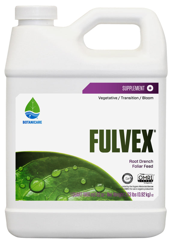 Botanicare Fulvex is an OMRI listed liquid trace mineral extract that corrects nutrient lock-out conditions and amplifies nutrient uptake. Formulated using a patented formula, Fulvex® increases the availability of nutrients and mineral diffusion into root cells without the use of harsh chemicals to maximize plants growth and yield capacities. Fortified with over 72 trace minerals.